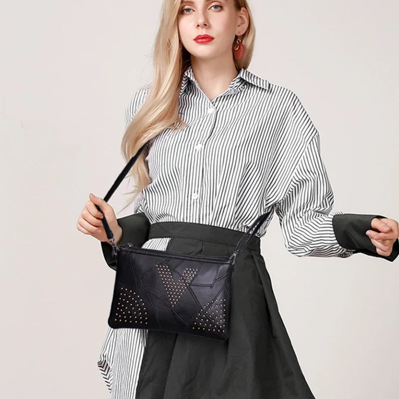 Women’s Black Rivet Shoulder Bag – Small Crossbody Messenger Handbag
